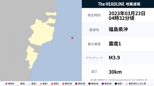 3月23日4時32分頃、福島県・茨城県で最大震度1の地震を観測
