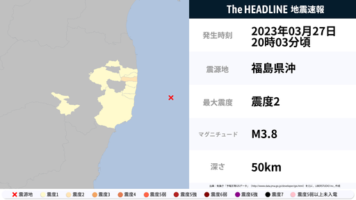 3月27日20時3分頃、福島県で最大震度2の地震を観測
