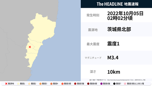 10月5日2時2分頃、福島県・茨城県で最大震度1の地震を観測