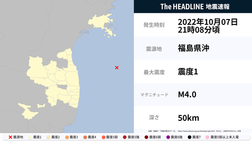 10月7日21時9分頃、宮城県・福島県で最大震度1の地震を観測