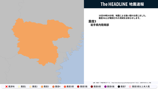 10月10日9時26分頃、岩手県で震度3以上の地震を観測