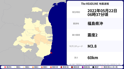 5月22日06時38分頃、福島県で最大震度2を観測する地震がありました。