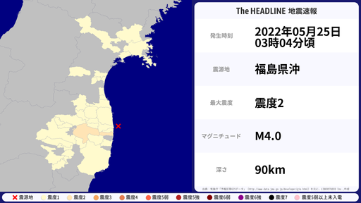 5月25日03時04分頃、福島県で最大震度2を観測する地震がありました。