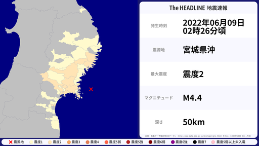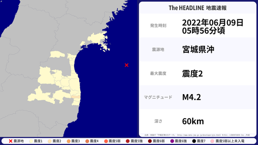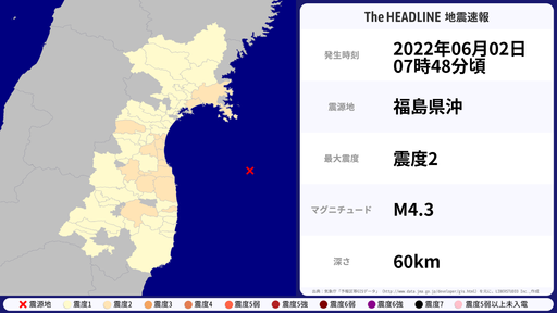 6月2日07時48分頃、宮城県などで最大震度2を観測する地震がありました。