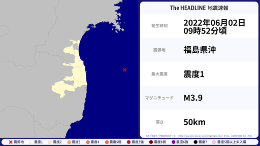 6月9日05時57分頃、福島県で最大震度2を観測する地震がありました。