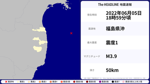 6月5日18時59分頃、福島県で最大震度1を観測する地震がありました。