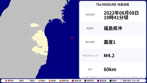 6月8日19時42分頃、宮城県などで最大震度1を観測する地震がありました。