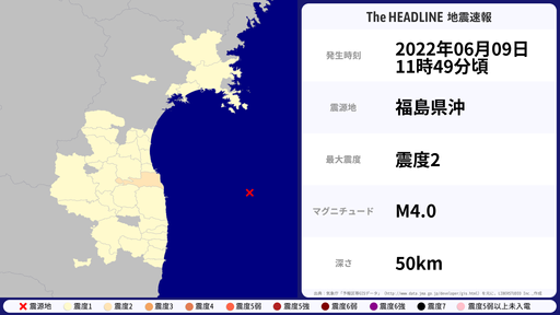6月9日11時49分頃、福島県で最大震度2を観測する地震がありました。