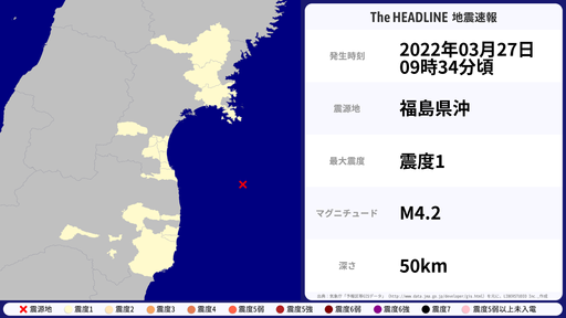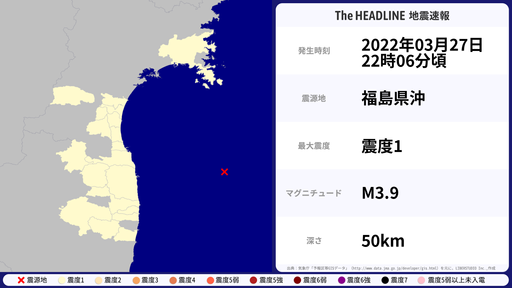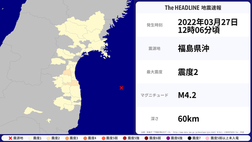 3月27日20時12分頃、福島県で最大震度2を観測する地震がありました。