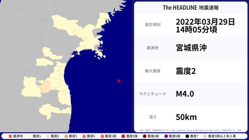 3月29日14時05分頃、福島県で最大震度2を観測する地震がありました。