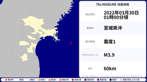 3月30日01時00分頃、宮城県などで最大震度1を観測する地震がありました。