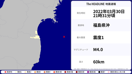 3月30日21時31分頃、宮城県などで最大震度1を観測する地震がありました。