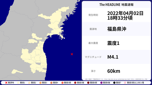4月1日02時54分頃、福島県で最大震度1を観測する地震がありました。