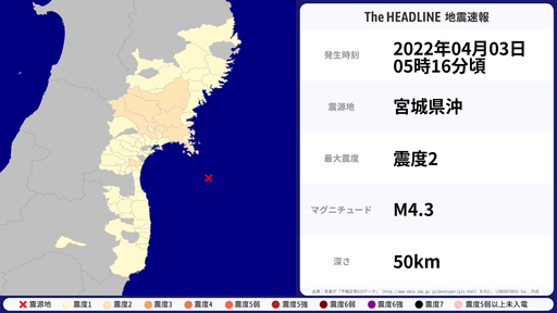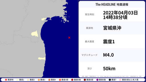 4月3日14時38分頃、宮城県などで最大震度1を観測する地震がありました。