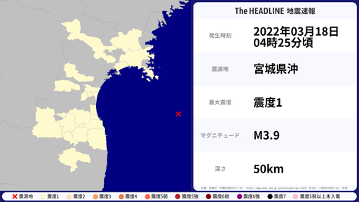 3月18日04時26分頃、宮城県などで最大震度1を観測する地震がありました。