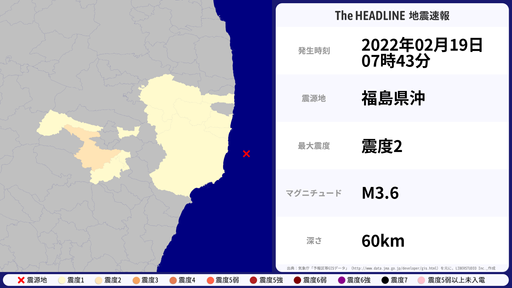 2月19日07時44分頃、福島県で最大震度2を観測する地震がありました。