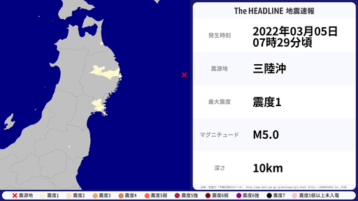3月5日10時28分頃、福島県などで最大震度1を観測する地震がありました。