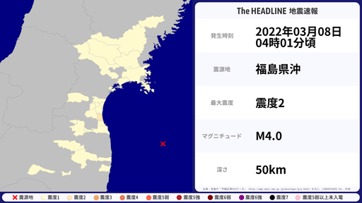 3月8日04時01分頃、宮城県で最大震度2を観測する地震がありました。