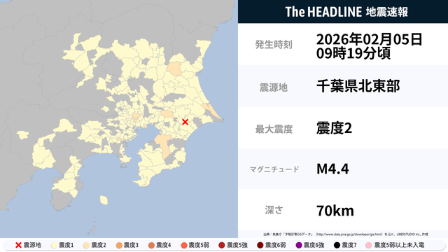 02月05日09時19分頃、千葉県北東部を震源とするマグニチュード4.4の地震が観測された。最大震度2を観測したのは、茨城県・千葉県など。