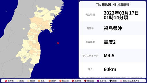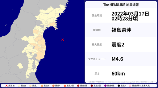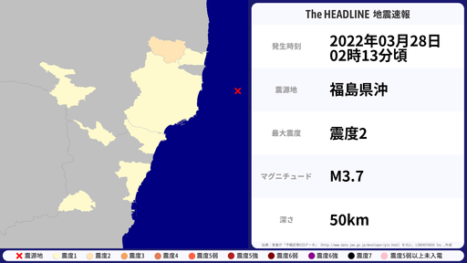 3月28日02時14分頃、福島県で最大震度2を観測する地震がありました。