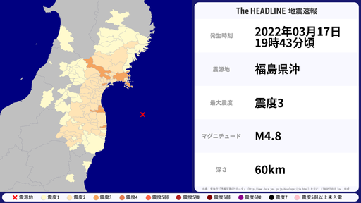 3月17日21時30分頃、福島県で最大震度3を観測する地震がありました。