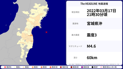 3月17日19時43分頃、宮城県などで最大震度3を観測する地震がありました。