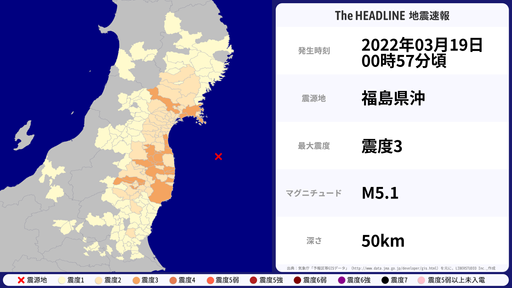 3月19日00時58分頃、宮城県などで最大震度3を観測する地震がありました。