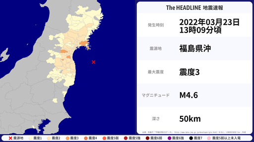 3月23日13時09分頃、宮城県などで最大震度3を観測する地震がありました。