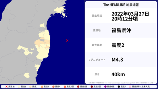 3月27日20時12分頃、福島県で最大震度2を観測する地震がありました。
