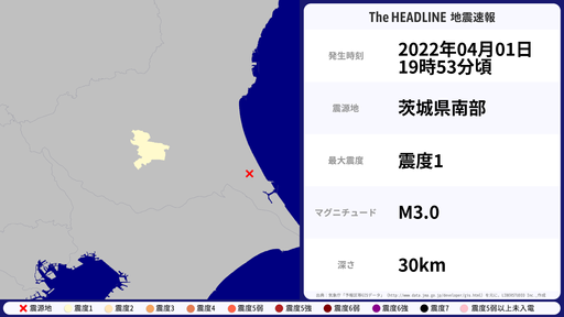 4月1日19時53分頃、茨城県で最大震度1を観測する地震がありました。