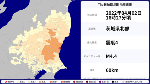 4月2日16時27分頃、茨城県で最大震度4を観測する地震がありました。