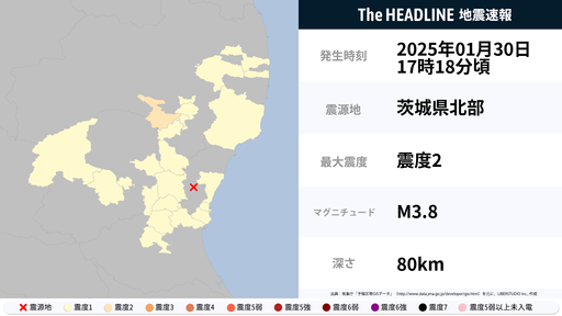 1月30日17時18分頃、福島県で最大震度2の地震を観測