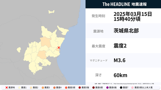 3月15日15時40分頃、茨城県で最大震度2の地震を観測