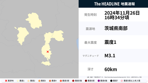 11月26日16時34分頃、茨城県・栃木県で最大震度1の地震を観測