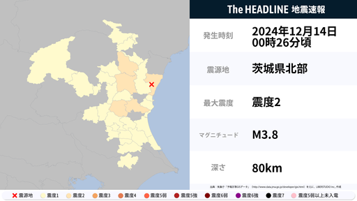 12月14日0時26分頃、茨城県で最大震度2の地震を観測