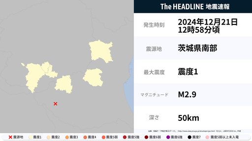 12月21日12時58分頃、茨城県・栃木県で最大震度1の地震を観測
