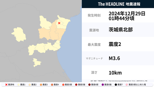 12月29日1時44分頃、茨城県で最大震度2の地震を観測