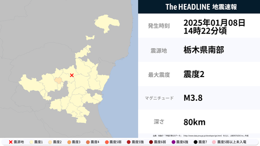 1月8日14時22分頃、栃木県で最大震度2の地震を観測