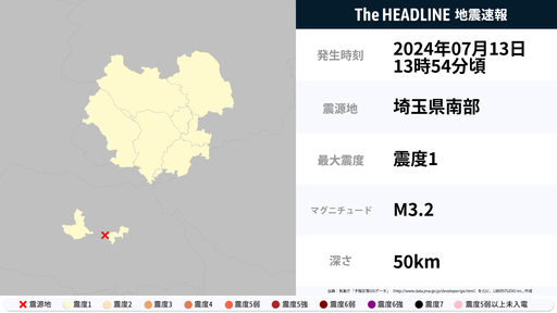 7月13日13時54分頃、栃木県・埼玉県で最大震度1の地震を観測