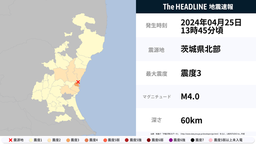 4月25日13時46分頃、茨城県で最大震度3の地震を観測