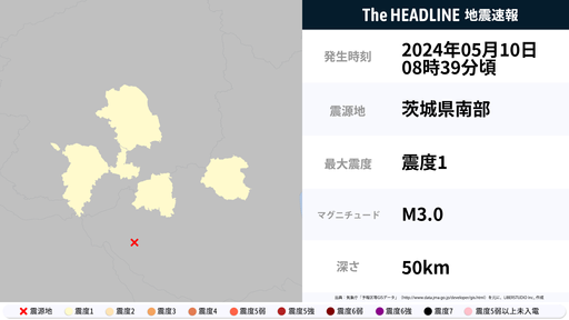 5月10日8時39分頃、茨城県・栃木県で最大震度1の地震を観測