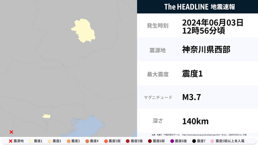 6月3日12時57分頃、栃木県・東京都で最大震度1の地震を観測