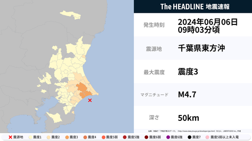 6月6日9時3分頃、千葉県で最大震度3の地震を観測