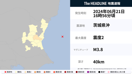 6月21日16時56分頃、茨城県で最大震度2の地震を観測