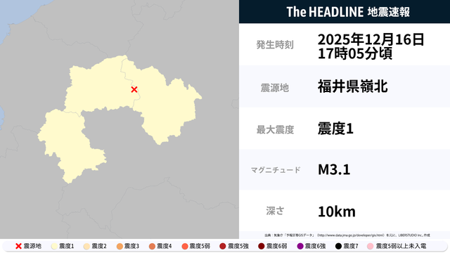 12月16日17時05分頃、福井県嶺北を震源とするマグニチュード3.1の地震が観測された。最大震度1を観測したのは、福井県・岐阜県。