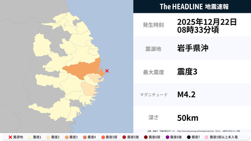 12月22日8時33分頃、岩手県で最大震度3の地震を観測