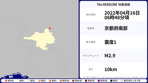 4月16日06時49分頃、京都府で最大震度1を観測する地震がありました。