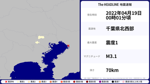4月19日00時01分頃、東京都で最大震度1を観測する地震がありました。