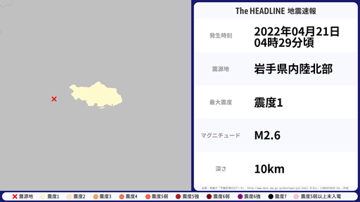 4月21日04時29分頃、岩手県で最大震度1を観測する地震がありました。