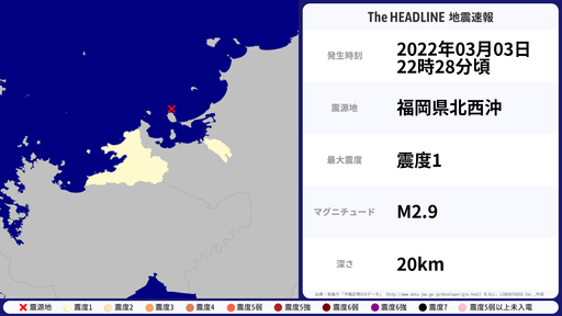 3月3日22時28分頃、福岡県で最大震度1を観測する地震がありました。